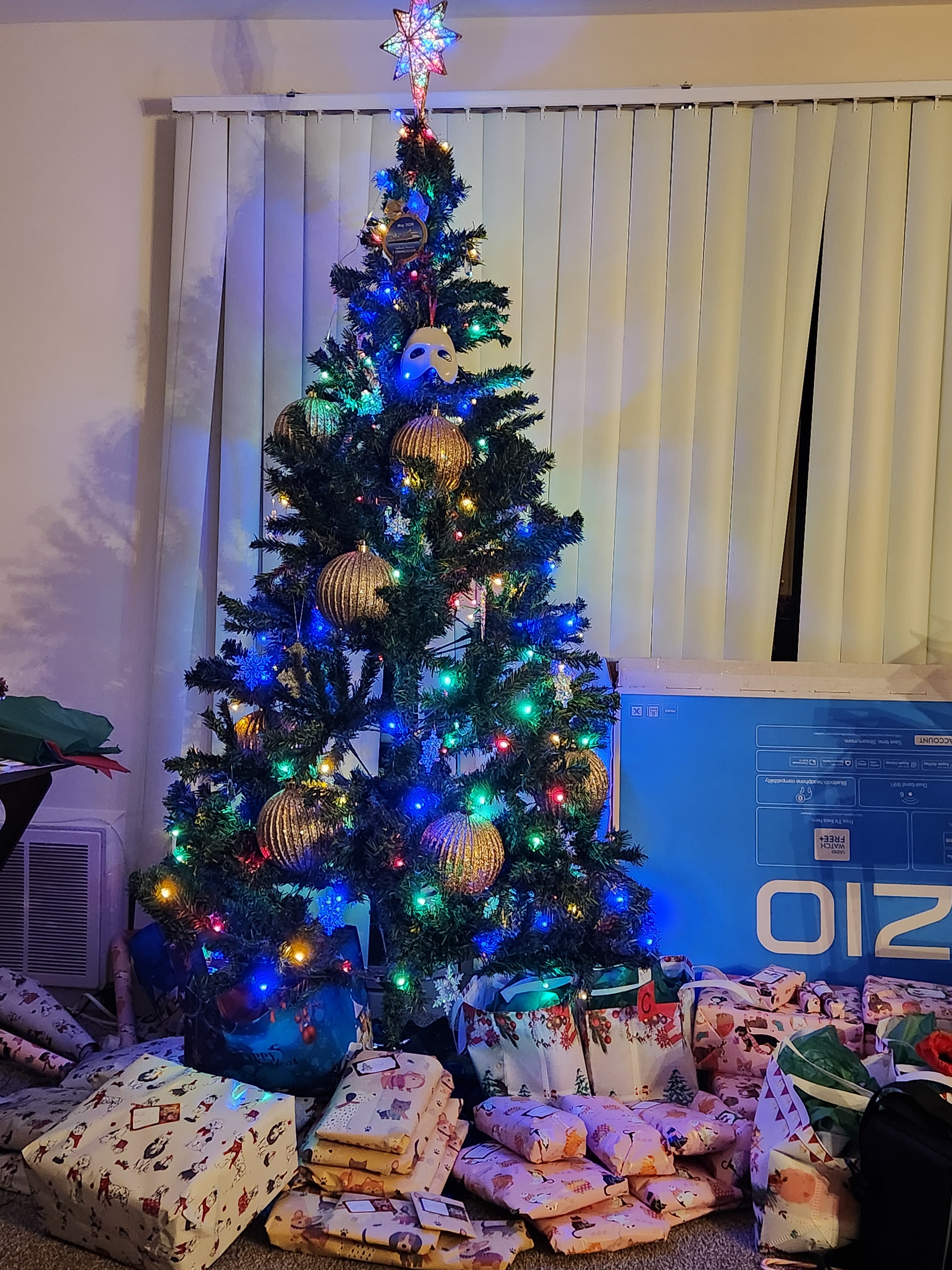 It's decorated with a few really big balls, plus some snowflakes and icicles. The oddball ornaments are the Phantom of the Opera mask, which we got at the play. We have a cruise ship ornament, with the ship name and date of the cruise, and there's a Ghost ornament. Because no tree is complete without a little Papa V.